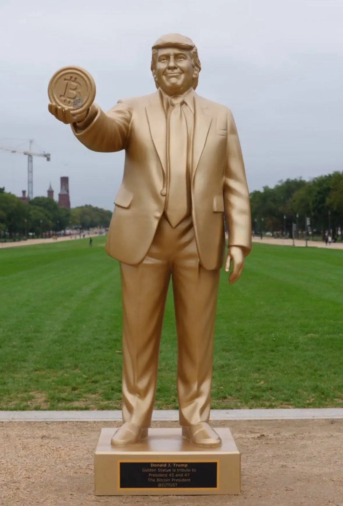9月18日,美联储降息当日,美国国会大厦外竖起一座特朗普手持Bitcoin的金色雕像。